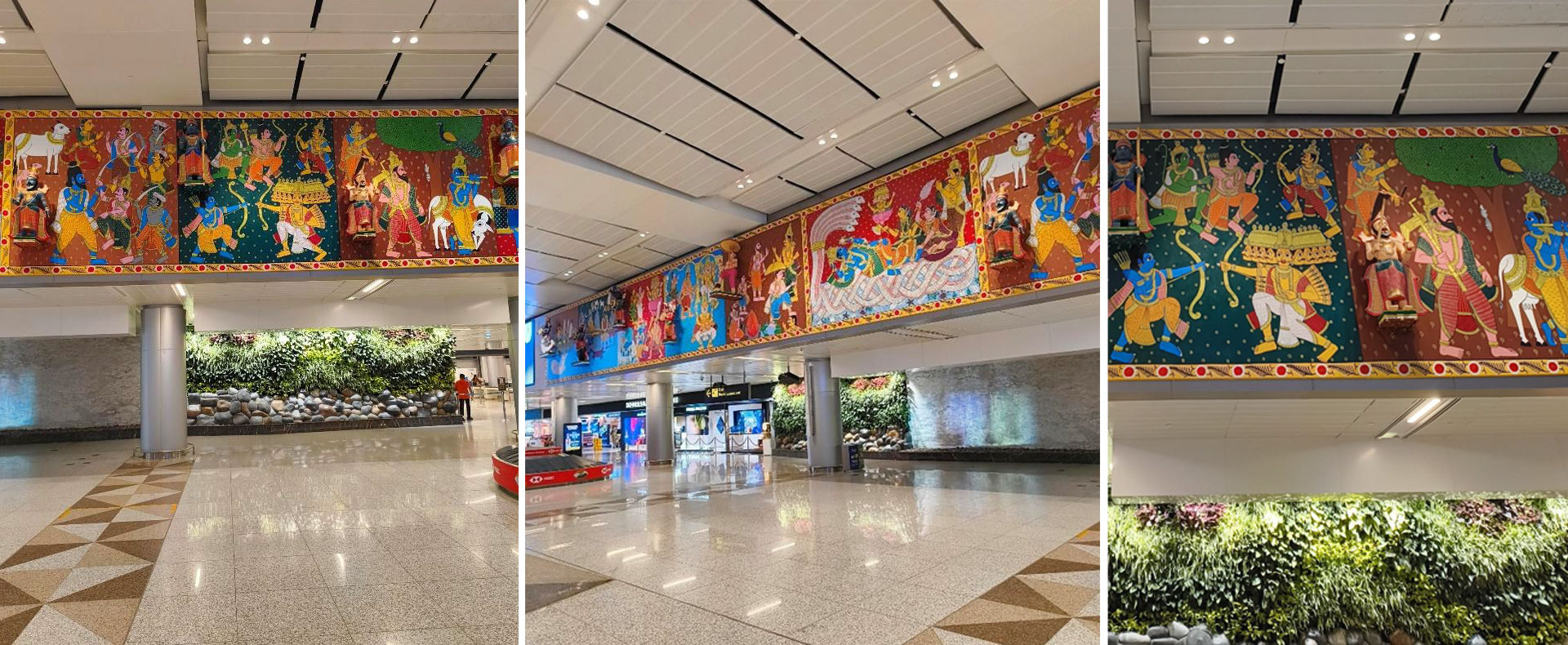 This installation symbolizes how art and tradition come together to narrate timeless stories of protecting cosmic order. This installation serves as a bridge between the past and present, offering you a warm welcome and a glimpse into artistic and cultural soul of traditional art forms. As you wait for your baggage, take a moment to connect with the timeless stories of transformation, protection and restoration that resonate these deities, reminding you that Hyderabad is not just a city of history but also of living tradition.